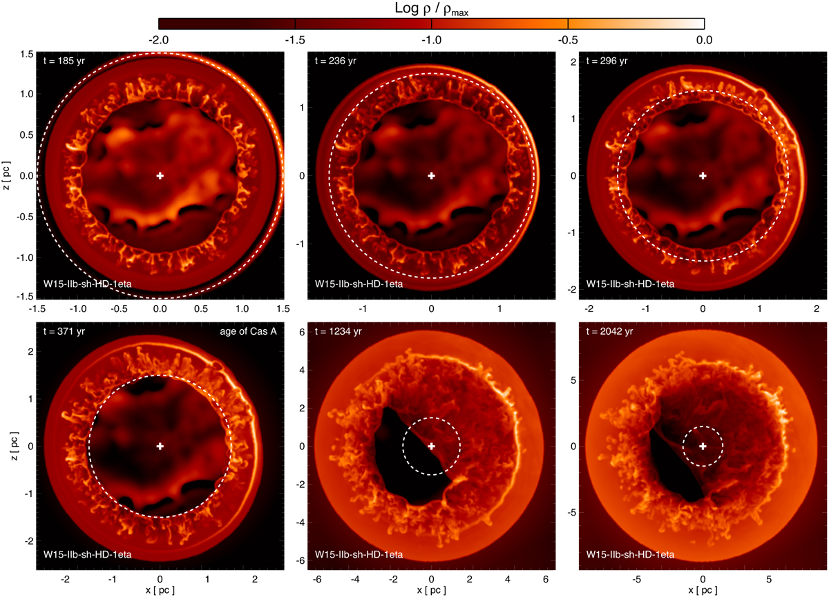 Sezione del materiale riscaldato e compresso dall’onda d’urto in Cas A negli intervalli di tempo indicati nei singoli pannelli. Il cerchio tratteggiato mostra la posizione della guscio di materiale circumstellare (notare la scala spaziale che aumenta per seguire l’espansione del resto di supernova), mentre la croce indica il centro dell’esplosione. Crediti: S.. Orlando et al. A&A, 2022