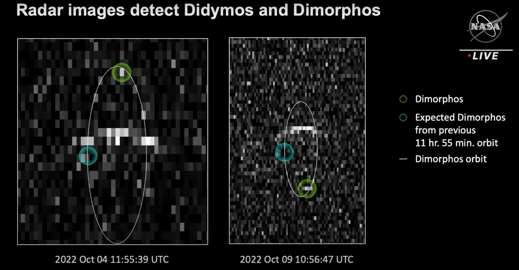 Osservazioni radar fatte da Goldstone che mostrano la posizione osservata e attesa di Dimorphos dopo l’impatto di Dart (cliccare per ingrandire). Crediti: Nasa/Johns Hopkins Apl/Jpl/Nasa Jpl Goldstone Planetary Radar/National Science Foundation’s Green Bank Observatory