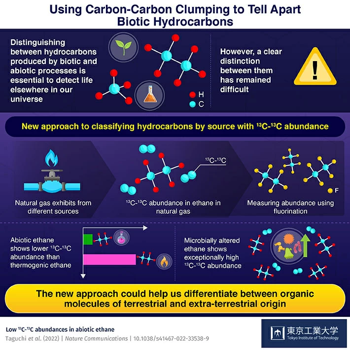 Infografica sul nuovo approccio metodologico messo a punto dai ricercatori per distinguere l’origine biologica o non biologica delle molecole organiche. Crediti: Taguchi et al. – Nature Comminications, 2022