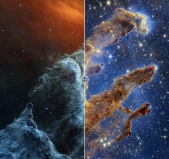 Migliaia e migliaia di stelle si sono formate in questa regione, e ciò risulta evidente quando si esamina la recente immagine di questo oggetto ripresa dalla NirCam (Near-InfraRed Camera) di Webb. Nell’immagine di Miri, la maggior parte delle stelle sembra assente. Come mai? Molte stelle di recente formazione non sono più circondate da una quantità di polvere sufficiente per poter essere rilevate nella luce del medio infrarosso. Miri, quindi, rileva solamente quelle stelle giovani che non si sono ancora spogliate del loro “mantello” polveroso. Sono le sfere di color cremisi che si trovano ai margini dei pilastri. Per contro, le stelle blu che punteggiano lo scenario stanno invecchiando, il che significa che si sono liberate della maggior parte degli strati di gas e polvere.