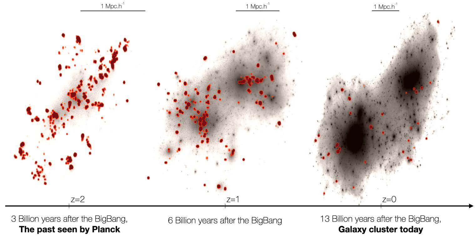 «Tramite queste simulazioni siamo riusciti a spiegare la natura delle sorgenti selezionate da Planck. Queste sorgenti sono considerate i predecessori degli ammassi di galassie osservati durante una fase di intensa attività di formazione stellare. Negli ammassi di galassie questa attività è pressoché assente, ma in passato queste stesse galassie hanno formato molte stelle. Sapere come, quando e perché questa attività di formazione stellare è avvenuta richiede scovare le galassie proprio durante queste fasi di crescita. Le sorgenti Planck sono state selezionate con questo obiettivo, ma stabilirne l’evoluzione e determinare se effettivamente queste evolveranno in ammassi di galassie non è banale e per questo il confronto con le simulazioni è così importante, perché proprio tramite esso siamo stati in grado di stabilire che più del 70 per cento dei sistemi selezionati in base al loro elevato livello di attività di formazione stellare è destinato a evolvere in un ammasso di galassie all’età attuale dell’universo».