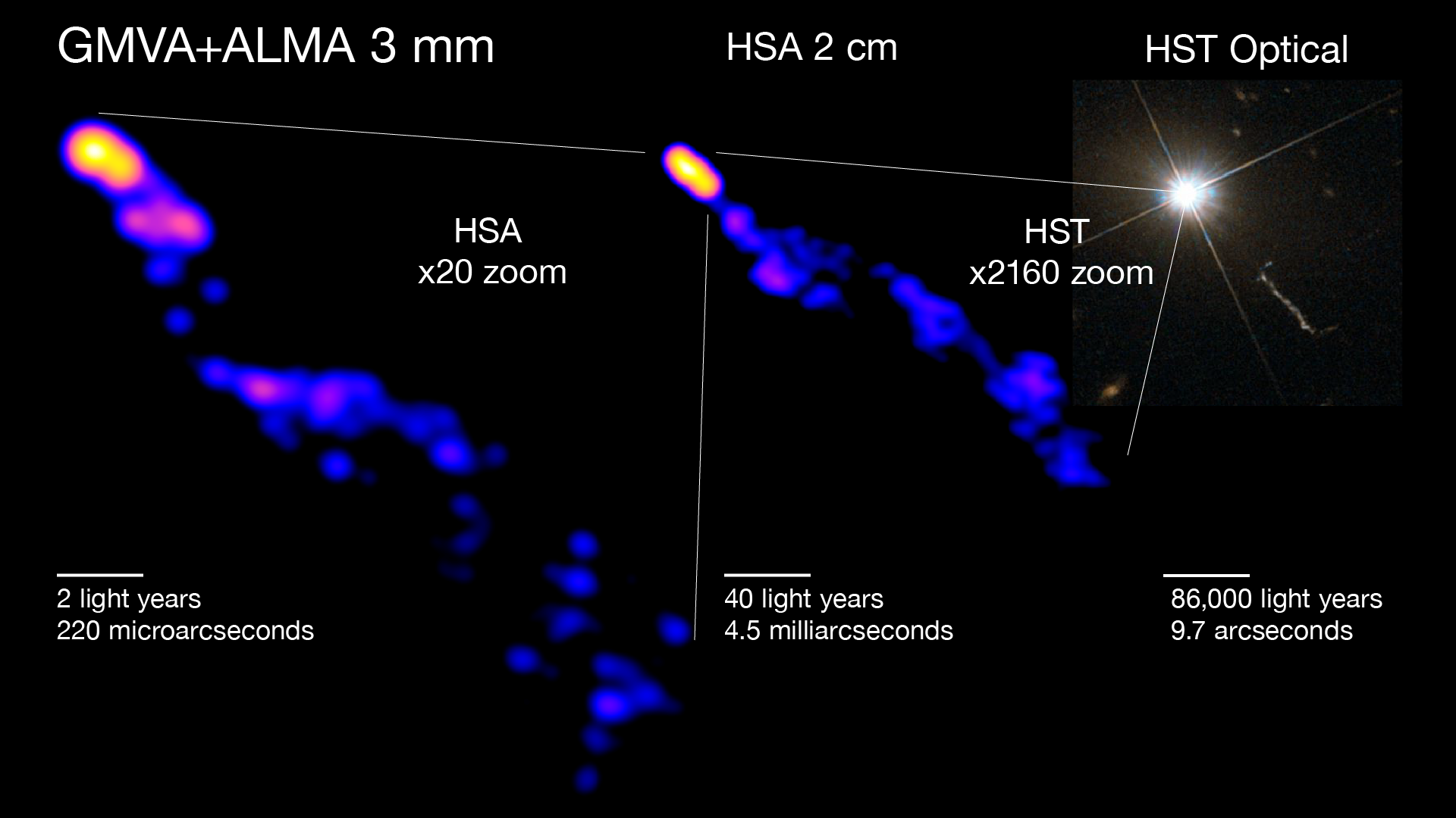 Il getto del quasar 3C 273 dalle estremità più profonde (a sinistra, ripreso dagli array di radiotelescopi Gmva e Alma e al centro, dall’High Sensitivity Array) a quelle più lontane (a destra, in un’immagine del telescopio spaziale Hubble). Crediti: Hiroki Okino and Kazunori Akiyama; Gmva+Alma and Hsa images: Okino et al.; Hst Image: Esa/Hubble & Nasa