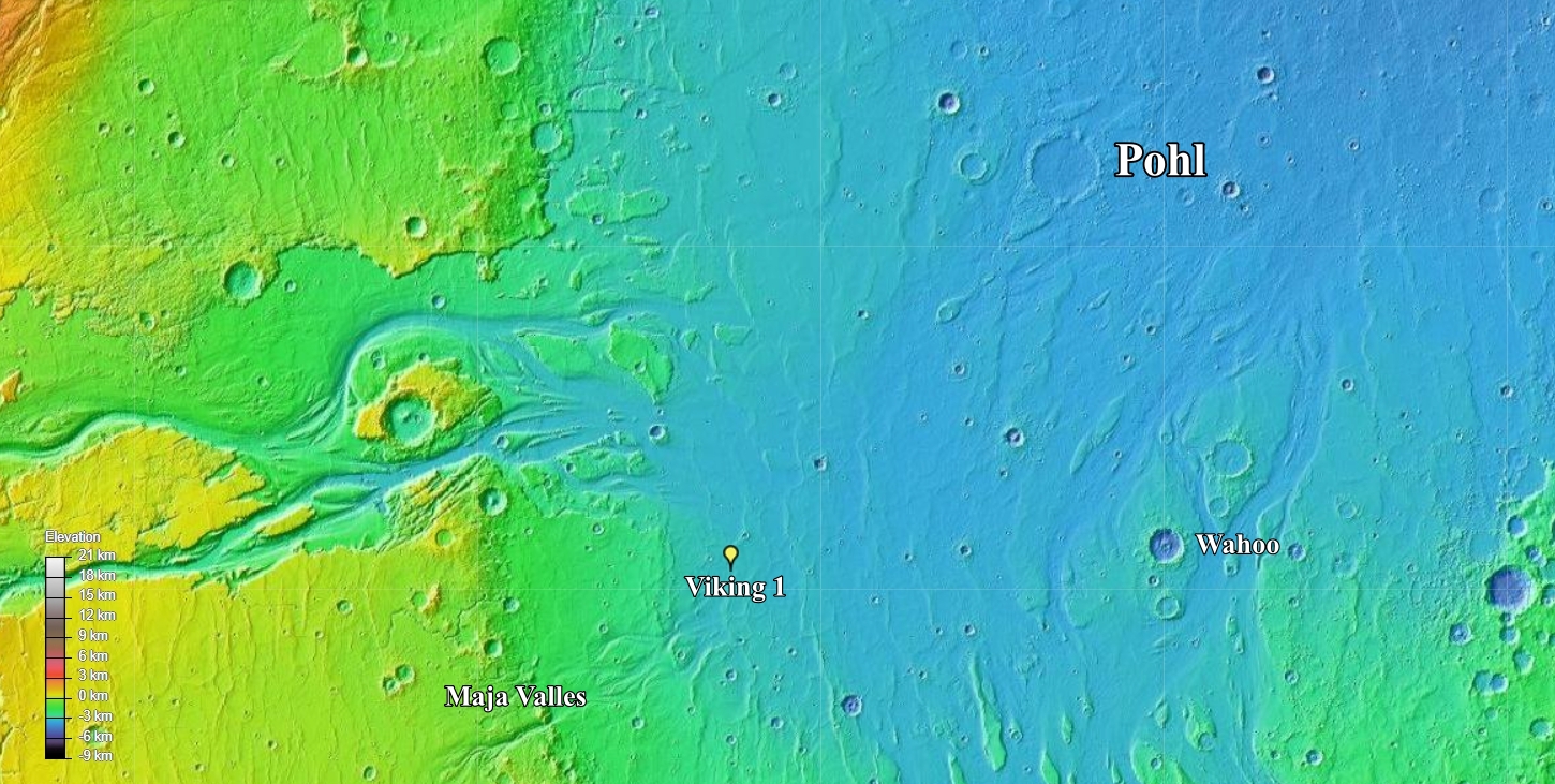 Mappa altimetrica della Chryse Planitia con indicate le posizioni di Maja Valles, il lander del Viking 1 e il cratere Pohl. Crediti: Nasa/Jpl/Gsfc