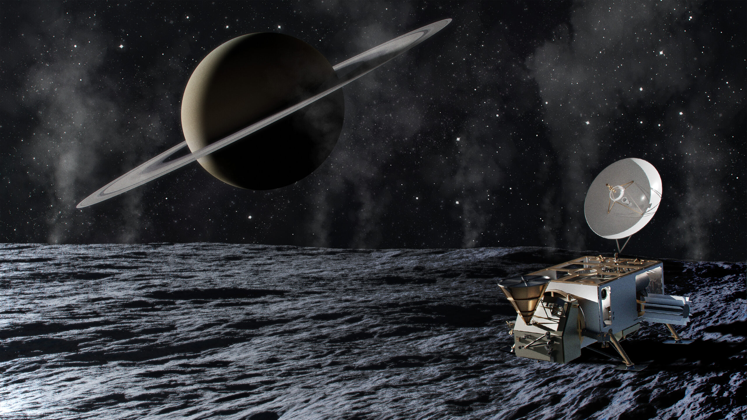 Rappresentazione artistica di Enceladus Orbilander sulla superficie di Encelado. Crediti: Johns Hopkins Apl
