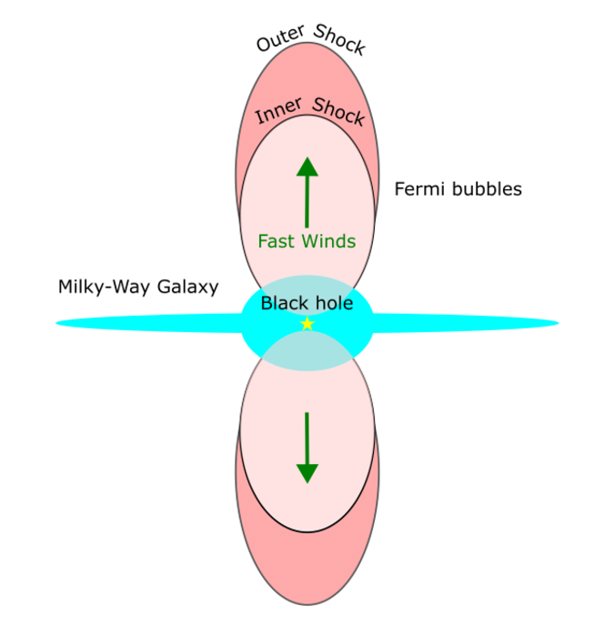 Confrontando i dati ottenuti dalle osservazioni X con quelli prodotti dalle sue simulazioni, Fujita è giunto a concludere che, con buona probabiità, all’origine delle “bolle di Fermi” vi sia proprio un vento di particelle cariche espulse dal centro della nostra galassia: un flusso che viaggia ininterrotto da oltre dieci milioni di anni a una velocità di mille chilometri al secondo. Questo flusso di particelle, essendo diretto verso l’esterno, finisce per interagire con il gas dell’alone galattico, provocando il cosiddetto reverse shock: un’onda d’urto – contraddistinta da un repentino aumento della temperatura nella regione di collisione – che dà forma alle bolle.