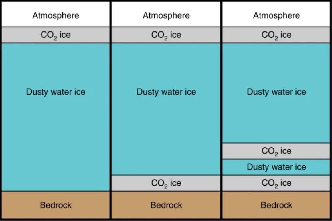Tre dei possibili “panini” marziani – o meglio, scenari di conformazione del sottosuolo, con strati (non in scala) alterni di CO2 e ghiaccio d’acqua – presi in esame dal team della Cornell. Crediti: Lalich et al., Nature Astronomy, 2022