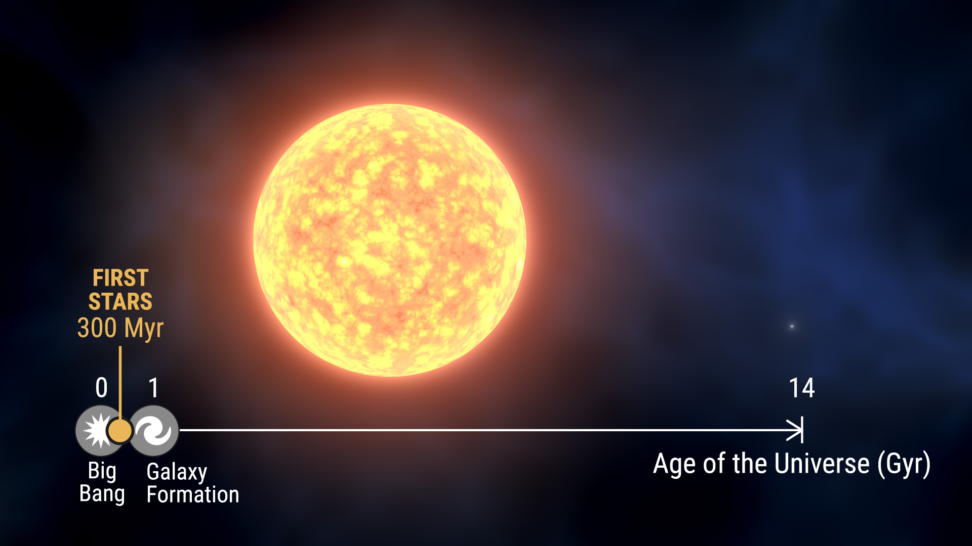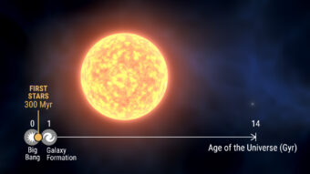 Rappresentazione artistica della stella gigante quasi primordiale Smss 1605-1443. L’asse delle ascisse riporta una scala temporale dell’età dell’universo con l’epoca della formazione delle prime stelle. Crediti: Gabriel Pérez, Smm (Iac)
