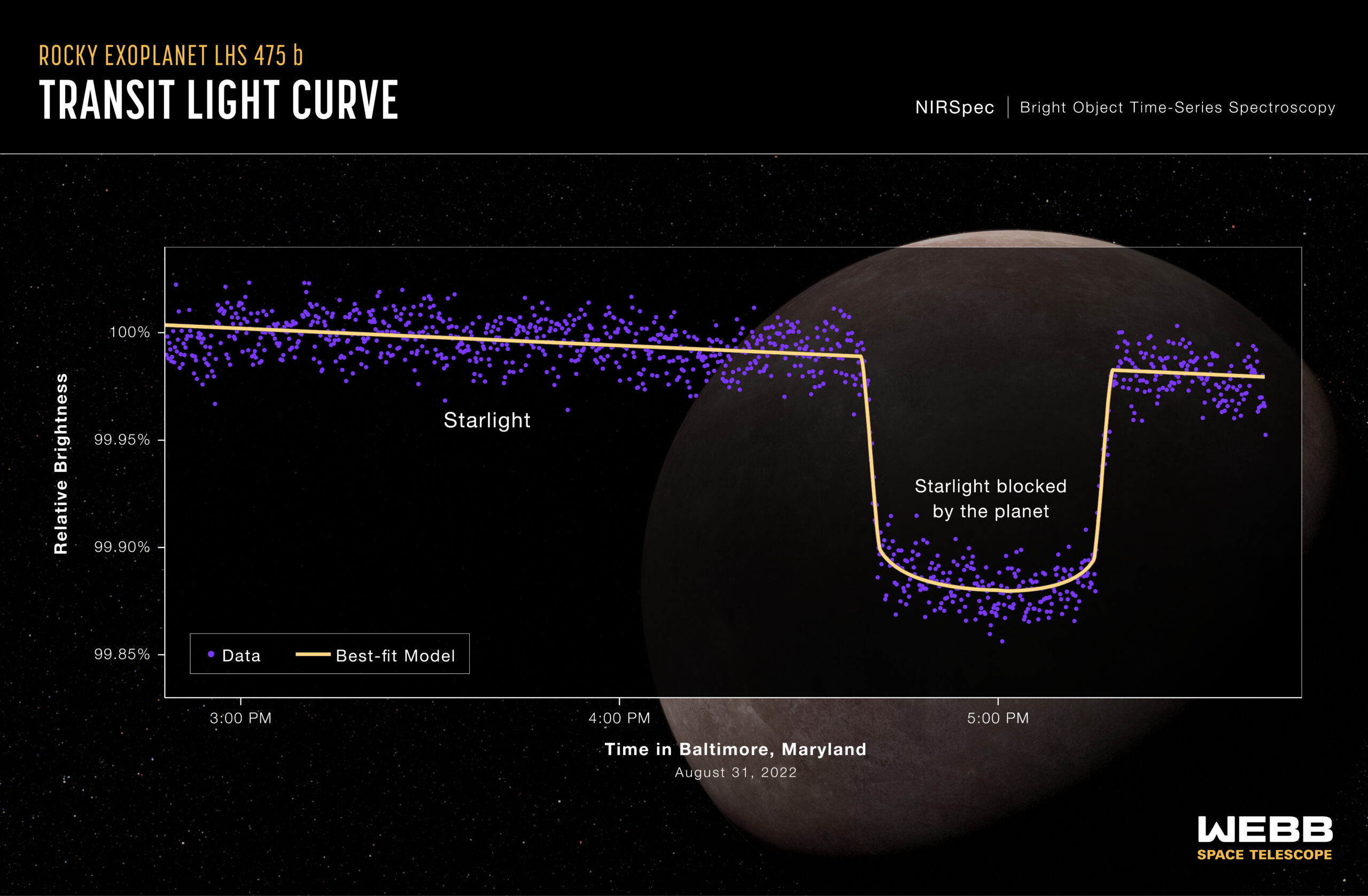 Esopianeta Lhs 475 b: la curva di luce misurata da NirSpec mostra il cambiamento di luminosità del sistema stellare nel tempo, mentre il pianeta transitava davanti alla stella il 31 agosto 2022. Crediti: Nasa, Esa, Csa, L. Hustak (StScI), K. Stevenson, J. Lustig-Yaeger, E. May (Johns Hopkins University Applied Physics Laboratory), G. Fu (Johns Hopkins University), and S. Moran (University of Arizona)