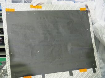 La targa, recante una riproduzione di tre pagine del ‘Sidereus Nuncius’, stampata su un pezzo di isolante multistrato – la “coperta” termica avvolta attorno alla sonda per mantenere stabili le temperature interne. Crediti: Airbus