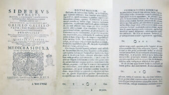 Frontespizio (a sinistra) e due pagine (centro e destra) con le osservazioni di Giove e delle sue lune, provenienti dalla copia del ‘Sidereus Nuncius’ custodita nella Biblioteca dell’Inaf – Osservatorio Astronomico di Roma sita presso Villa Mellini, che ospita anche la Sede centrale dell’Inaf. Il frontespizio riporta la firma storica del ‘Museo Copernicano a Roma’ e il nome dello studioso polacco Artur Wolynski, precedente proprietario del volume, che donò la sua collezione copernicana all’allora ufficio centrale di Meteorologia all’Osservatorio del Collegio Romano (il cui Direttore era designato dal Ministro dell’Agricoltura) nel 1882. Crediti: Inaf