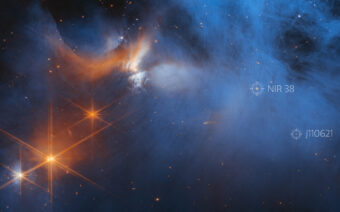Immagine della NirCam del Jwst che mostra la regione centrale della nube molecolare Chameleon I. Il materiale della nube (blu, al centro) è illuminato nell’infrarosso dalla giovane protostella Ced 110 Irs 4 (arancione, in alto a sinistra). Le due stelle di sfondo utilizzate in questo studio, Nir38 e J110621, sono indicate in bianco. Crediti: Nasa, Esa, Csa, M. Zamani (Esa/Webb), F. Sun (Steward Observatory), Z. Smith (Open University), Ice Age Ers Team.