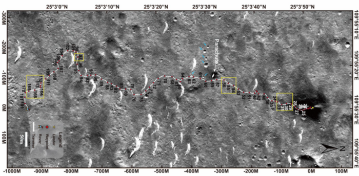 Sito di atterraggio e percorso del rover Zhurong, con box gialli intorno a regioni di particolare interesse. Crediti: Chinese National Science Administration