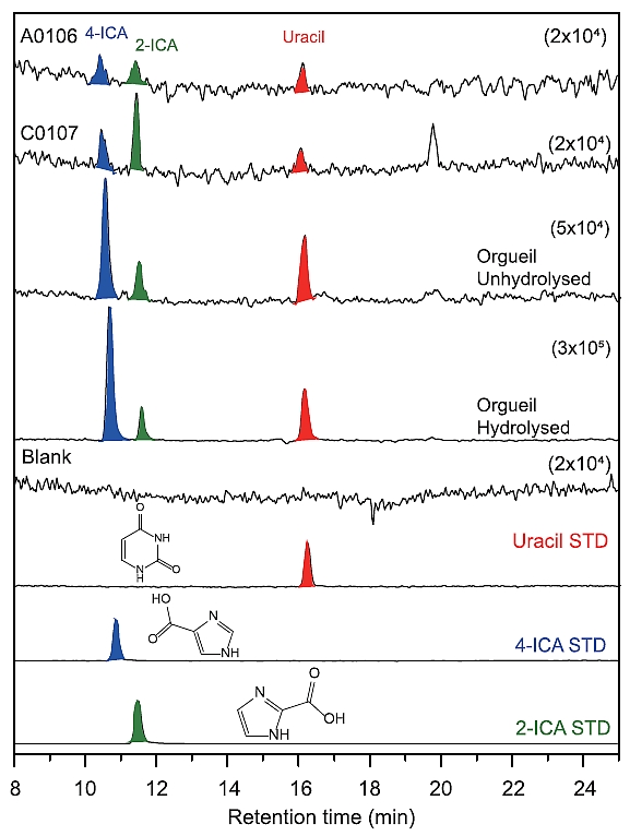 Il team ha analizzato i campioni A0106 e C0107, raccolti dal primo e dal secondo sito di atterraggio sull’asteroide Ryugu. I campioni, con una massa di circa 10 mg, sono stati sottoposti ad estrazione con acqua calda a 105 °C per 20 ore, seguita da idrolisi acida. Come campione di riferimento è stato usato l’estratto di acqua calda dal meteorite Orgueil così da poter confrontare il contenuto di nucleobasi. L’uracile è stato trovato nei due campioni A0106 e C0107 in piccole quantità, nell’intervallo 6-32 ppb, mentre la vitamina B3 era più abbondante, 49-99 ppb. Nei campioni sono state trovate anche altre molecole biologiche, tra cui una selezione di amminoacidi, ammine e acidi carbossilici, che si trovano rispettivamente nelle proteine e nei processi metabolici. I composti rilevati sono simili, ma non identici a quelli precedentemente scoperti nelle meteoriti carbonacee.