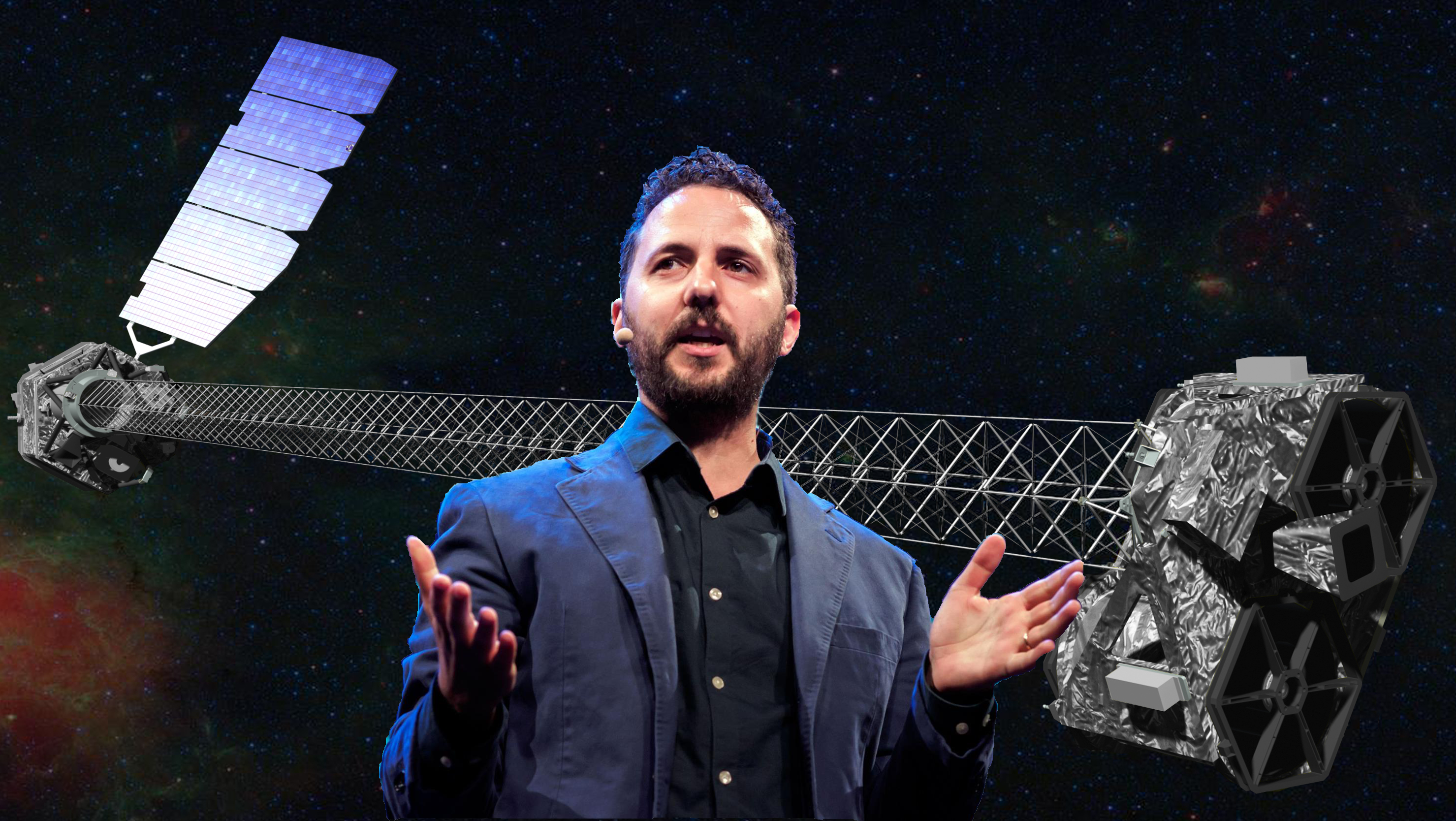 Matteo Bachetti, in primo piano, e sullo sfondo una rappresentazione artistica del telescopio satellitare ai raggi X NuStar. Crediti: Marco Giugliarelli/Famelab Italia (per la foto) e Nasa (per la rappresentazione artistica del satellite)