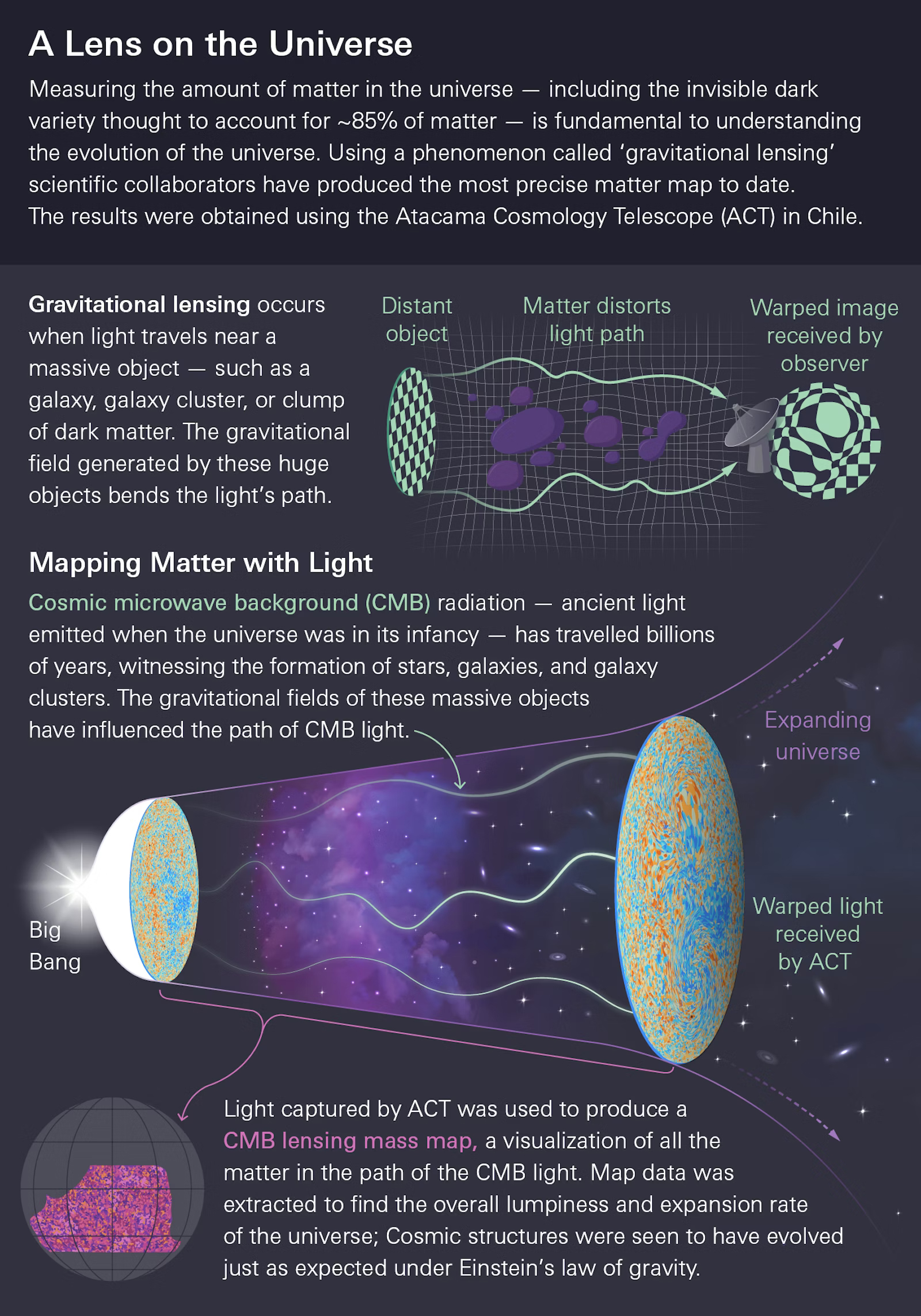 Infografica (in inglese) del procedimento seguito per produrre la mappa della distribuzione della materia oscura analizzando il suo effetto di lente gravitazionale sulla Cmb. Crediti: Lucy Reading-Ikkanda/Simons Foundation