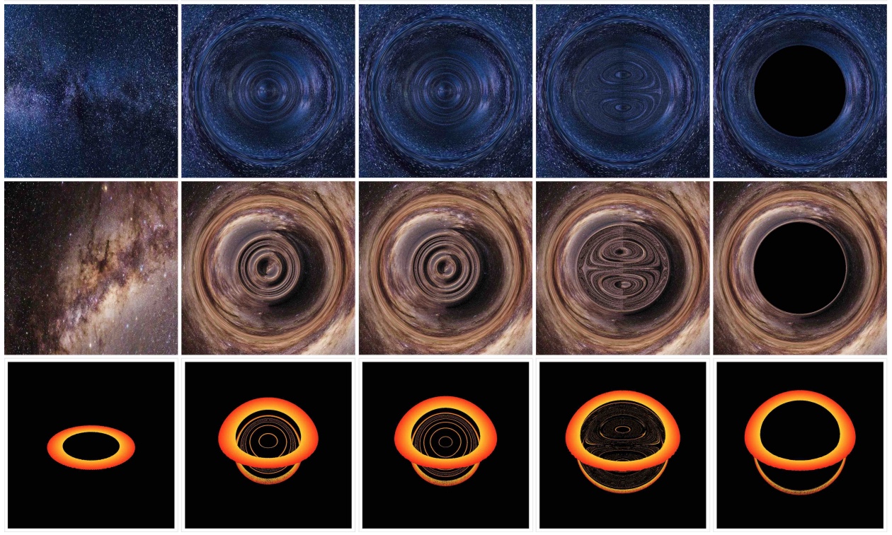 In questa sequenza animata, ecco gli effetti di lente gravitazionale in assenza di oggetti lungo la linea di vista dell’osservatore, in presenza di un buco nero e, infine, in presenza di un solitone topologico. Crediti: Pierre Heidmann/Johns Hopkins University