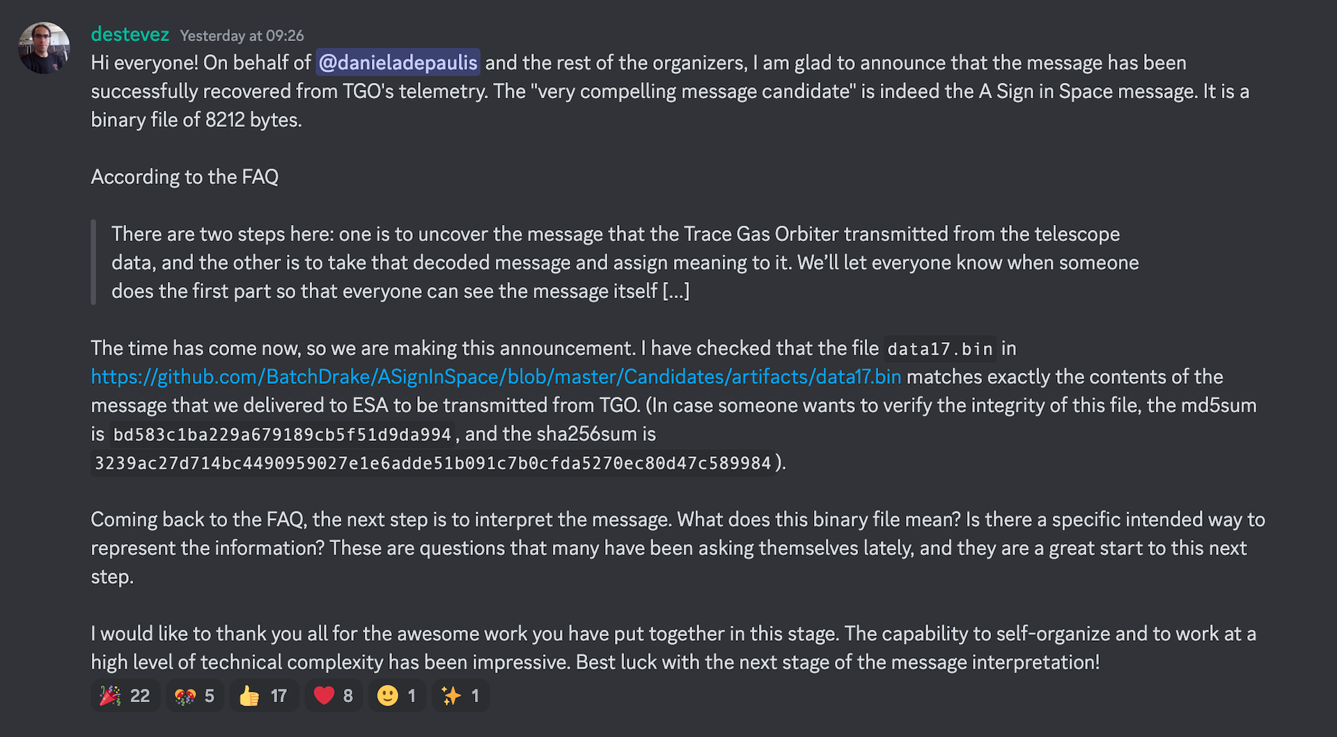 «È stato annunciato sulla piattaforma Discord che il messaggio è stato correttamente decodificato: si tratta di un file binario che contiene 8212 bit», spiegano gli esperti dell’Inaf. «A identificarlo è stato un vasto gruppo di utenti – i nickname dei principali collaboratori sono BatchDrake, kikuchiyo, indes99, skywalker e HaileyStorm – che hanno postato un messaggio su Discord alle 3:40 italiane della notte del primo giugno. Alle 9:20 è arrivata la conferma da parte di Daniel Estévez, ingegnere informatico e matematico spagnolo, a nome del team di A Sign in Space».
