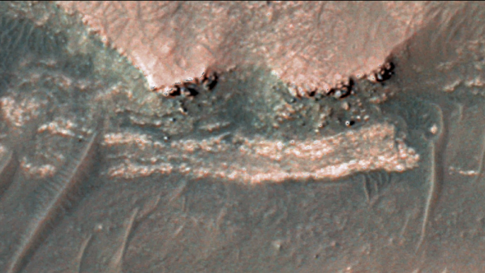 «Uno dei miei obiettivi preferiti di Curiosity si chiama Bonanza King, e prende il nome dalla formazione rocciosa Bonanza King vicino alla Death Valley. Qui [nell’immagine riportata a fianco, ndr] vediamo un’area che, osservata dallo spazio, assomiglia a una striscia di pancetta. Così l’abbiamo chiamata scherzosamente “the bacon strip”».