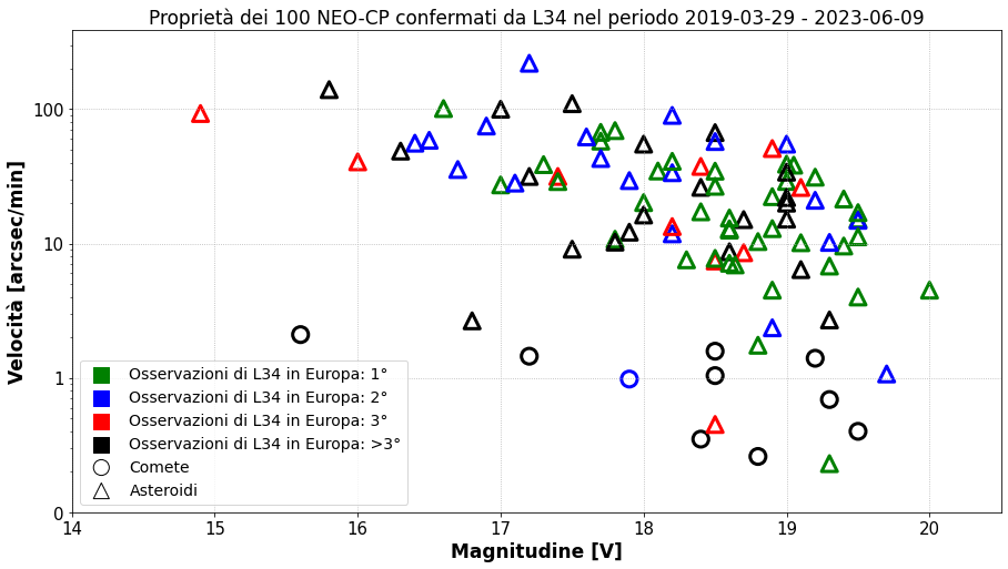 Distribuzione di magnitudine e velocità apparente dei cento Neo osservati con il Grt (cliccare per ingrandire). “L34” è il codice attribuito al Grt dal Minor Planet Center