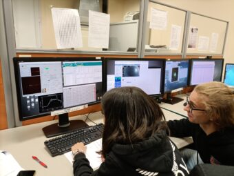 Ma questi momenti sono stati solo l’inizio di una serata ancor più emozionante. Ritornati al Tng, Chiara e Raffaele hanno potuto assistere in diretta all’apertura della cupola del più grande telescopio ottico/infrarosso italiano e ai test di inizio notte che implicano movimenti in elevazione e azimuth del telescopio stesso. Finiti i test, e subito dopo il tramonto, la sala di controllo con i suoi tanti computer ha atteso i ragazzi per vivere la loro prima esperienza da astronomi.