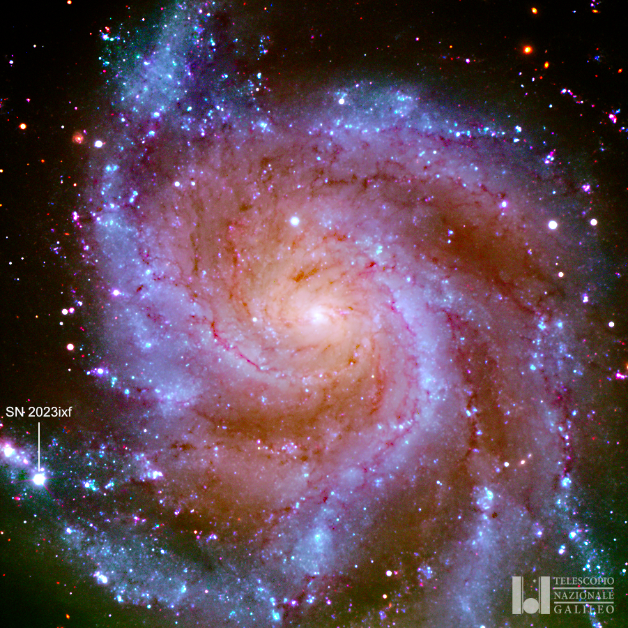 Immagine in tre colori della galassia M101 con la Sn2023 Ixf osservata da Chiara e Raffaele utilizzando lo strumento Lrs@Tng. Crediti: A. Harutyunyan