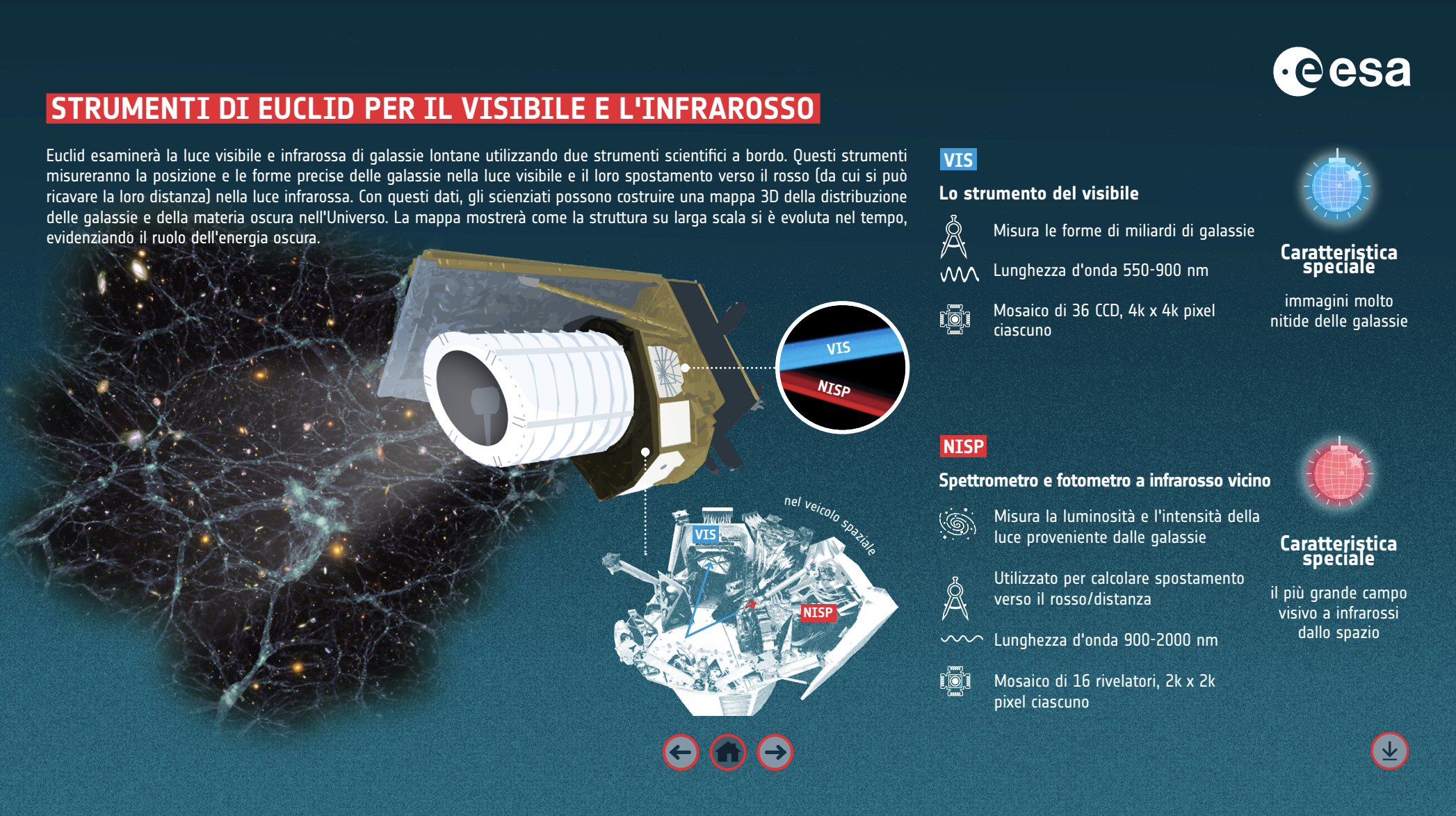 Nasce da lontano la conoscenza della geometria che, grazie al matematico e filosofo greco Euclide, ha rivoluzionato la misura dello spazio, anche con le leggi che portano il suo nome. Euclid, non a caso, è anche il nome della missione appena decollata da Cape Canaveral. Si tratta di un programma scientifico dell’Esa, uno dei più ambiziosi nel quale l’Italia, attraverso l’Agenzia spaziale italiana (Asi), l’Istituto nazionale di astrofisica (Inaf) e l’Istituto nazionale di fisica nucleare (Infn), gioca un ruolo da protagonista. Il satellite Euclid ospita un telescopio a specchio di 1,2 metri di diametro e due strumenti scientifici, il Vis (Visible Instrument) e il Nisp (Near Infrared Spectrometer Photometer), che avranno l’obiettivo principale di osservare il cielo extragalattico con lo scopo di ottenere immagini con altissima risoluzione e misurare gli spettri di milioni di galassie.