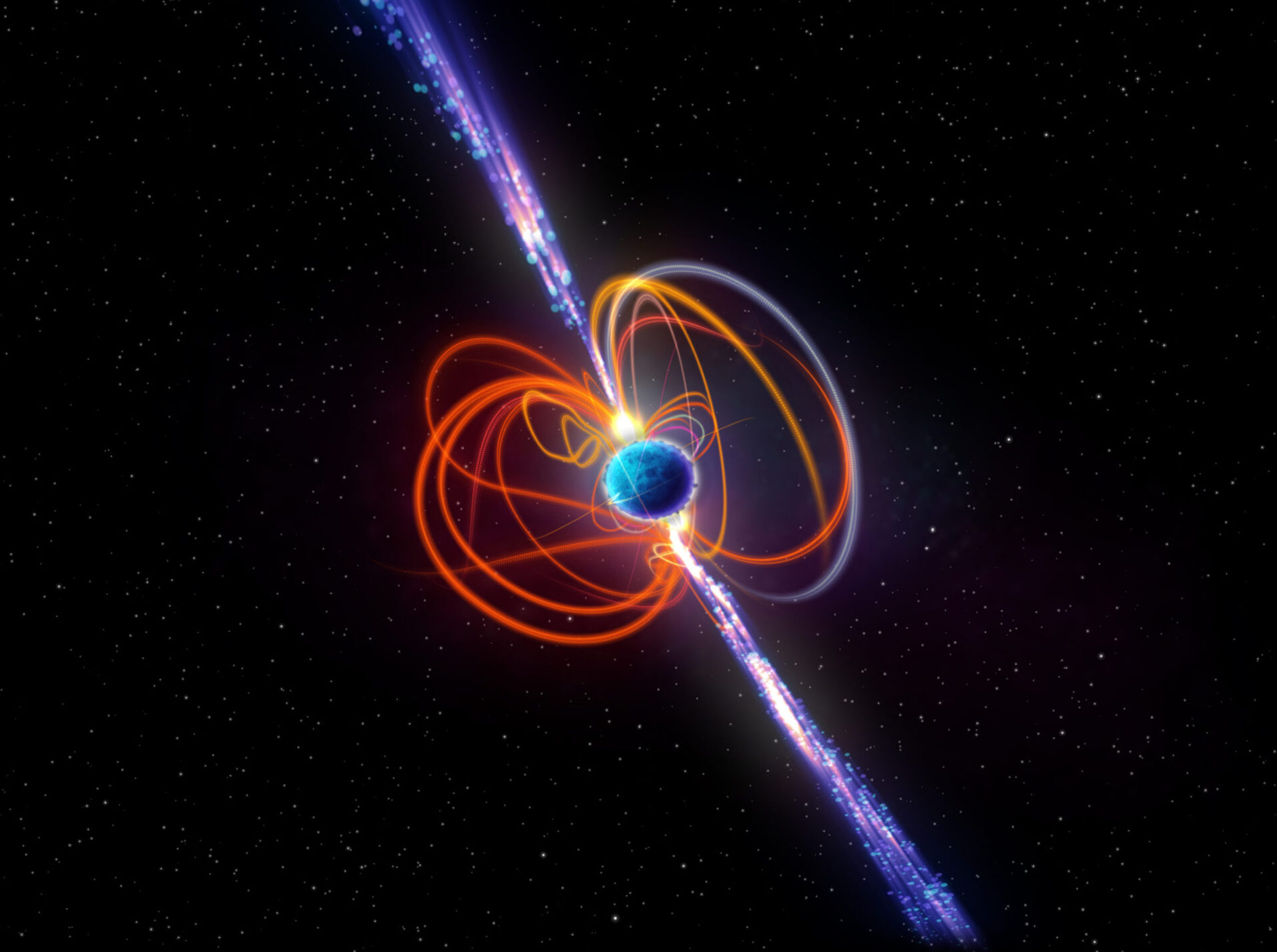 Rappresentazione artistica di una magnetar a periodo ultra-lungo, un raro tipo di stella con campi magnetici estremamente forti in grado di produrre potenti esplosioni energetiche. L’oggetto appena scoperto emette onde radio di 5 minuti ogni 21 minuti, rendendolo la magnetar con il periodo più lungo mai rilevato. Gli astronomi lo hanno scoperto utilizzando il Murchison Widefield Array (Mwa), un radiotelescopio nel Wajarri Yamaji Country nell’entroterra dell’Australia occidentale. Crediti: Icrar