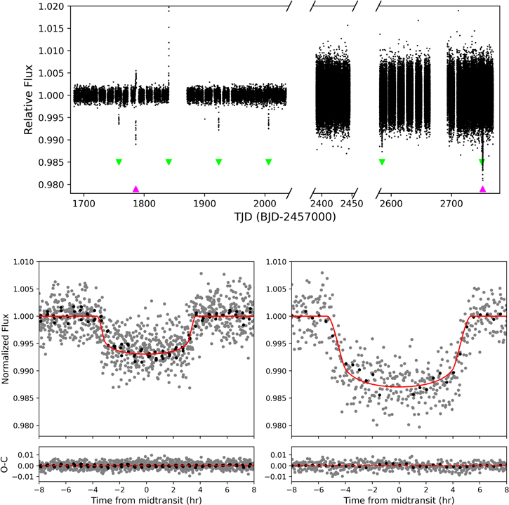 In alto: la curva di luce di Toi-4600 mostra quattro transiti di Toi-4600 b e due transiti di Toi-4600 c. Un ulteriore transito di Toi-4600 b è oscurato da un improvviso aumento sistematico del flusso dovuto alla luce diffusa vicino a Tbjd 1850 mentre un altro transito a Tbjd 2750 è oscurato da un transito di Toi-4600 c che avviene 1,5 giorni dopo. Un altro transito di Toi-4600 b vicino a Tbjd 2419 si è verificato durante un gap di downlink e quindi non è stato osservato da Tess. Crediti: Mireles et al, 2023
