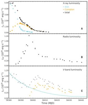 In questo studio, i ricercatori hanno eseguito un’analisi dei dati a più lunghezze d’onda dell’esplosione della binaria a raggi X del buco nero Maxi J1820+070. Hanno osservato che l’emissione di raggi X duri mostrava un picco seguito da un ulteriore picco nell’emissione radio, 8 giorni dopo. Un ritardo così lungo tra l’emissione radio del getto e i raggi X duri del flusso caldo di accrescimento non ha precedenti.