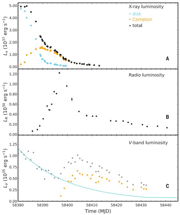Curva dell’emissione X (in alto), radio (al centro) e nel visibile (in basso), in funzione del tempo, del sistema binario X del buco nero Maxi J1820+070, in cui è evidente come il picco alle varie frequenze si presente in momenti successivi. Crediti: SHAO