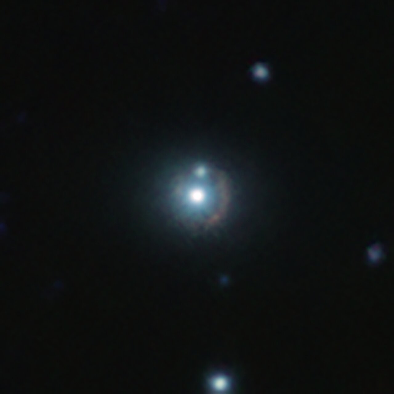 Questa immagine a infrarossi mostra la lontana galassia 9io9, vista qui come un arco rossastro curvato intorno a una galassia vicina a noi e luminosa. La galassia vicina agisce come una lente gravitazionale: la sua massa curva lo spaziotempo intorno a sé, piegando i raggi luminosi provenienti da 9io9 sullo sfondo e producendone la forma distorta. Questa veduta a colori è il risultato della combinazione di immagini a infrarossi scattate con Vista (Visible and Infrared Survey Telescope for Astronomy) dell’Eso in Cile e con il Chft (Canada France Hawaii Telescope) negli Stati Uniti. Crediti:
