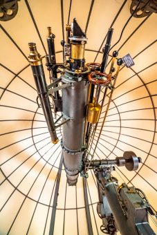 Alto circa sette metri, il telescopio di Collurania fu costruito dalla ditta Cooke & Sons in Inghilterra nel 1885. L’obiettivo doppio ha una apertura libera di 39,4 cm ed una distanza focale di 591 cm. Il moto orario a velocità costante avveniva per mezzo di un sistema a caduta di pesi, collegato a un regolatore a masse centrifughe. Lo strumento è risultato perfettamente riuscito dal punto di vista ottico per la limpidezza del suo obiettivo e per il notevole potere risolutivo. Crediti: M. Canzari/Inaf Oa Abruzzo