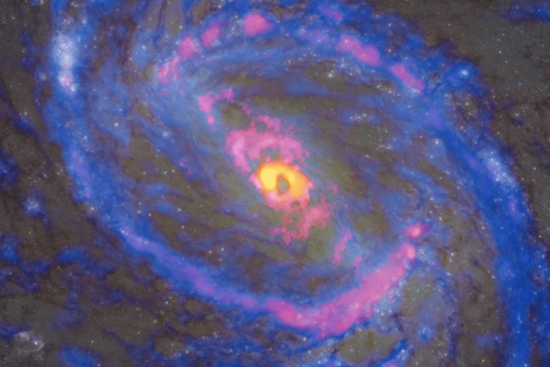 La galassia a spirale Messier 77 (Ngc 1068), osservata da Alma e dal telescopio spaziale Hubble. Gli isotopi del cianuro di idrogeno (H13CN), mostrati in giallo, si trovano solo attorno al buco nero al centro. I radicali di cianuro (CN), mostrati in rosso, appaiono non solo al centro e in una struttura gassosa a forma di anello su larga scala, ma anche lungo i getti bipolari che si estendono dal centro verso nord-est (in alto a sinistra) e sud-ovest (in basso a destra). Gli isotopi del monossido di carbonio (13CO), mostrati in blu, sembrano non essere presenti nella regione centrale. Crediti: Alma (Eso/Naoj/Nrao), Nasa/Esa Telescopio spaziale Hubble, T. Nakajima et al.)