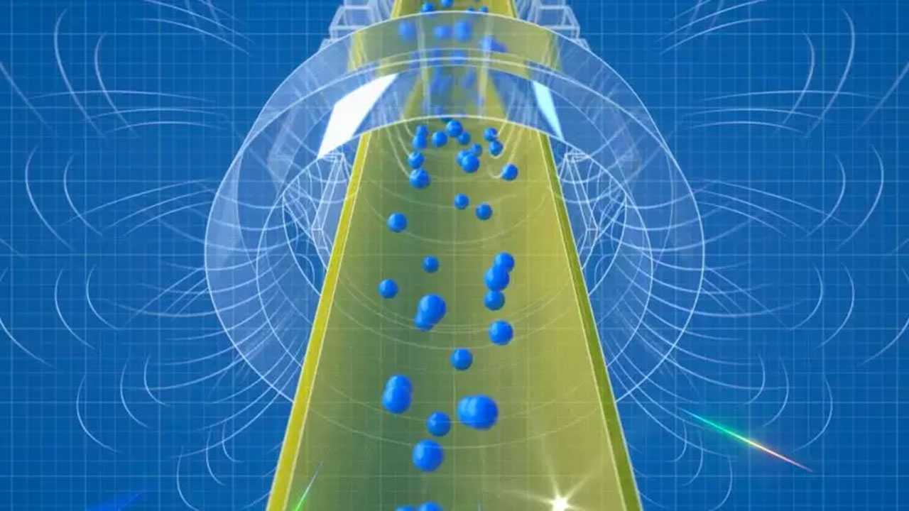 Un rendering concettuale degli atomi di anti-idrogeno che cadono dal fondo della trappola magnetica dell’apparato Alpha-g. Quando gli atomi di anti-idrogeno fuoriescono, toccano le pareti della trappola e si annichiliscono. La maggior parte delle annichilazioni avviene sul lato inferiore della trappola, a dimostrazione del fatto che la gravità attira l’anti-idrogeno verso il basso. Crediti: Keyi “Onyx” Li/U.S. National Science Foundation
