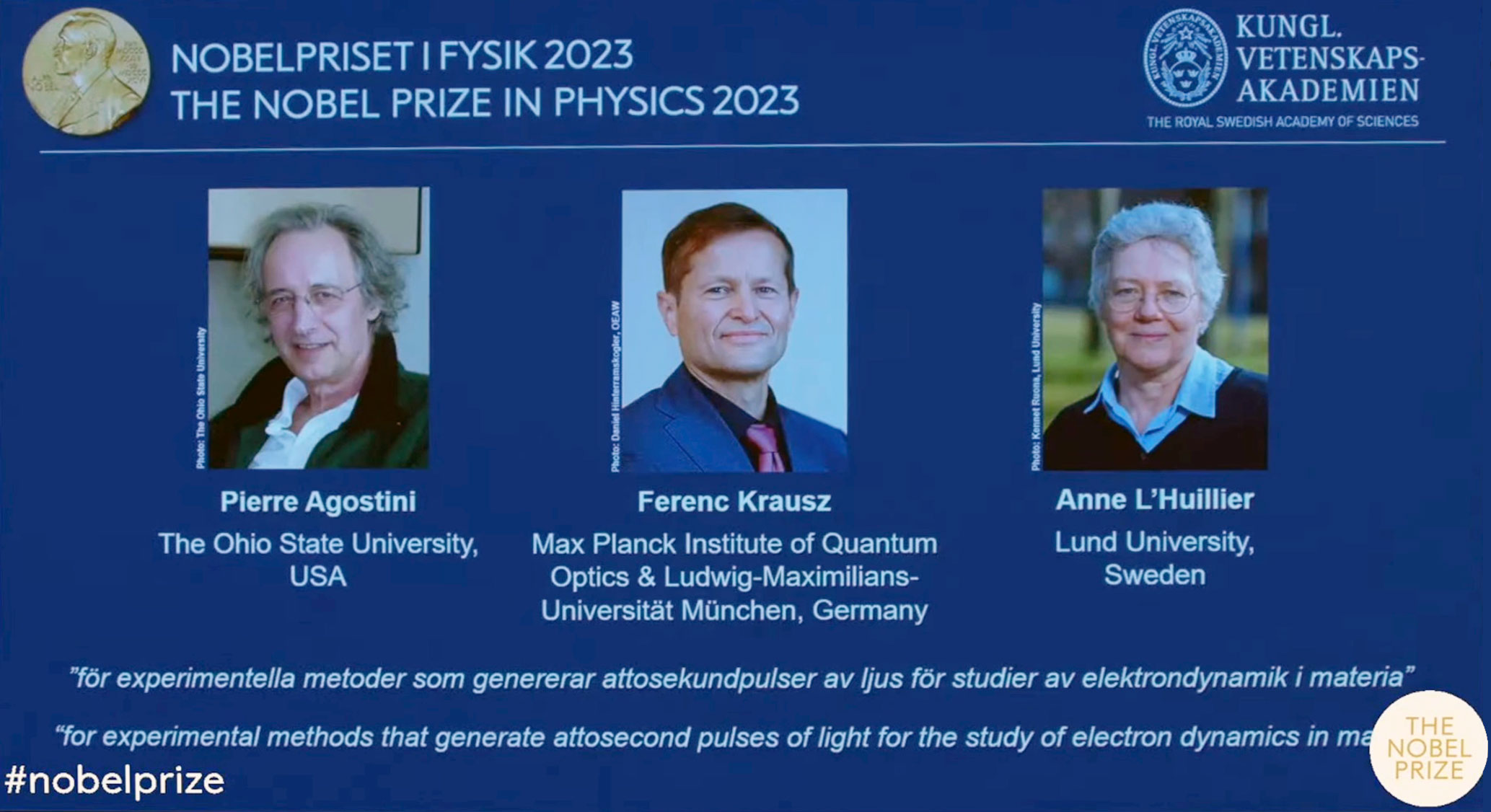 Loro sono Anne L’Huillier, fisica francese e appassionatissima insegnante all’Università di Lund in Svezia, Pierre Agostini, fisico francoamericano attualmente professore alla Ohio state university, e Ferenc Krausz, fisico ungherese che dal 2003 è direttore del Max Planck Institute for Quantum Optics di Garching e nel 2004 è diventato presidente di fisica sperimentale presso l’Università Ludwig Maximilian di Monaco di Baviera. Dopo aver ricevuto anche il premio Wolf per la fisica nel 2022, oggi a Stoccolma ha ricevuto – assieme a L’Huillier e Agostini – il premio Nobel per la fisica. “Per i metodi sperimentali che generano impulsi di luce ad attosecondi per lo studio della dinamica degli elettroni nella materia”, la spiegazione ufficiale: in altre parole, per aver abbattuto numerose barriere sperimentali e aver dimostrato che esiste un modo per creare impulsi di luce così brevi da poter “vedere” i tempi in cui si muovono gli elettroni nella materia.