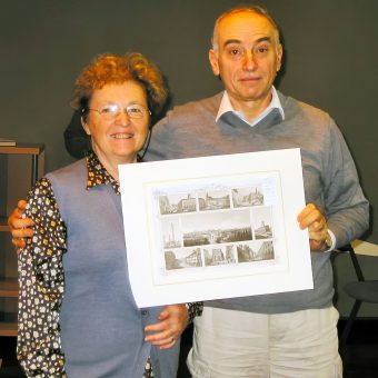 Roberto Fanti con sua moglie Carla il giorno di festeggiamento per il suo pensionamento nel 2005 mostra uno dei regali ricevuti: una serie di antiche stampe di Bologna. Crediti: I. Gioia