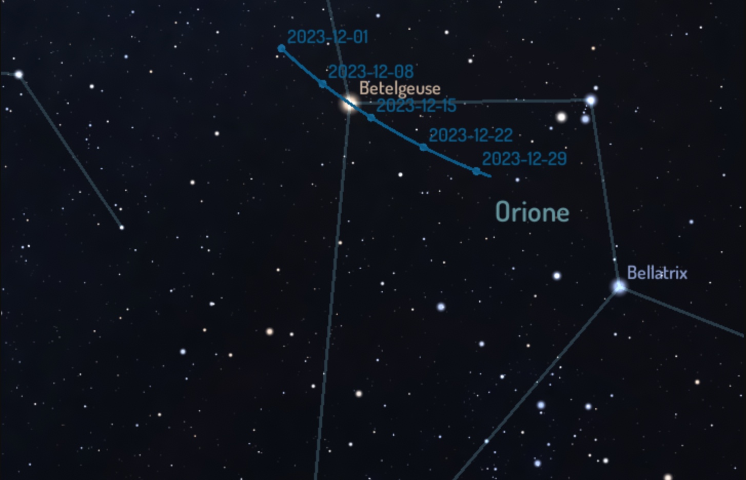 Traiettoria dell’asteroide 319 Leona nella costellazione di Orione. Il giorno 12 dicembre alle ore 2:13 circa di tempo locale occulterà la stella Betelgeuse