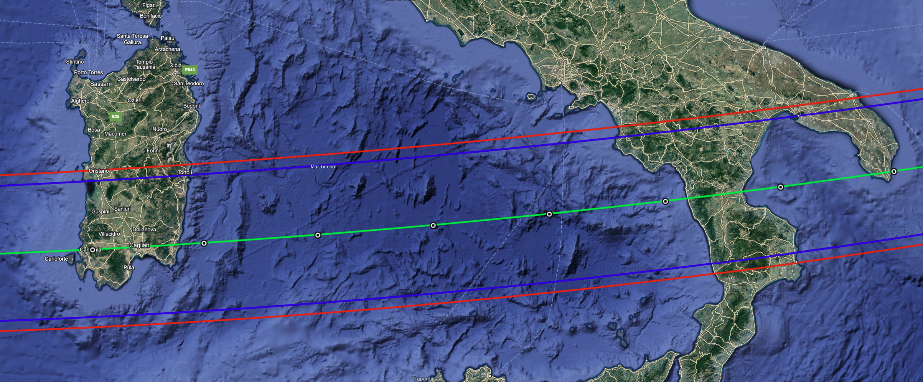 Zona di visibilità dell’occultazione di Betelgeuse da parte dell’asteroide 319 Leona. La linea verde rappresenta la linea centrade dell’occultazione. Le due linee blu sono i limiti di osservabilità mentre le linee rosse sono i limiti ad una deviazione standard (incertezza). Mappa creata con Google Earth e informazioni dal sito astrocampania.it