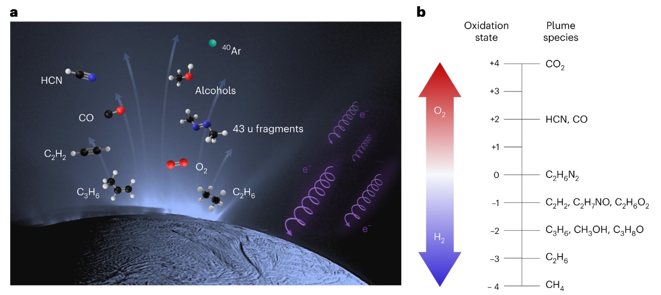 Nel riquadro a, illustrazione artistica dell’attività dei pennacchi su Encelado. L’attività crio-vulcanica della luna alimenta i getti contenenti molecole organiche con diversi stati di ossidazione emessi dalle fessure presenti al polo Sud della luna. Nel riquadro b, lo stato di ossidazione del carbonio nei composti organici presenti nei pennacchi. Crediti: Jonah S. Peter et al., Nature Astronomy, 2023