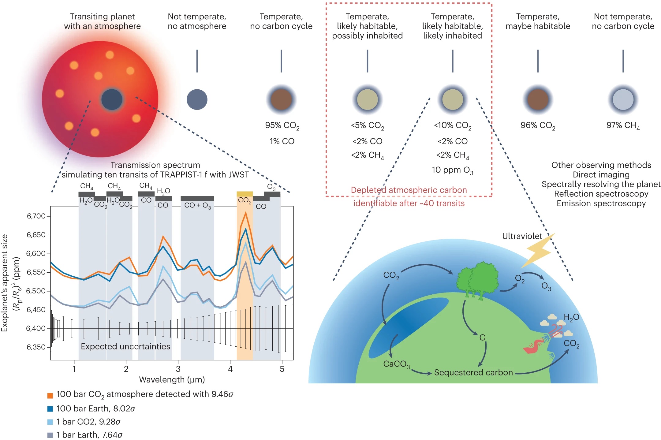 Illustrazione della strategia utilizzata dai ricercatori per trovare pianeti abitabili e abitati attraverso la rilevazione della CO2 atmosferica. In alto sono mostrati diversi pianeti con differenti caratteristiche di abitabilità. Il pannello in basso a sinistra riporta una simulazione dello spettro di trasmissione del pianeta roccioso Trappist-1 f. Il pannello in basso a destra mostra invece una versione semplificata del ciclo del carbonio, alla base della riduzione della CO2 atmosferica. Crediti: Amaury H. M. J. Triaud et al., Nature Astronomy, 2023