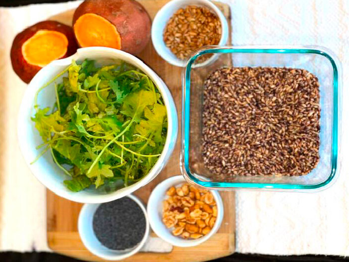 L’insalata spaziale ideale è composta da sette ingredienti: soia, semi di papavero, orzo, cavolo riccio, arachidi, semi di girasole e patate dolci. Crediti: Shu Liang et al., Acs Food Sci. Technol., 2023; Università di Adelaide