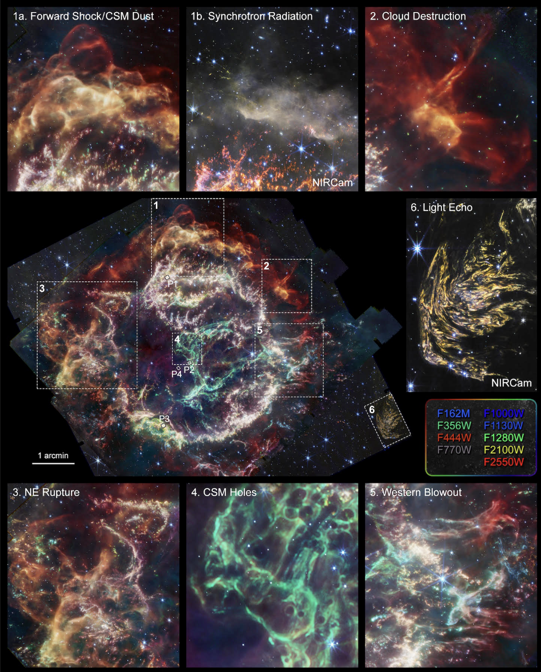 Questa immagine evidenzia diverse caratteristiche interessanti del resto di supernova Cassiopea A visto con gli strumenti NirCam (Near-Infrared Camera) e Miri (Mid-infrared instrument) di Webb. Un esempio è la “eco di luce” (dettaglio 6) che avviene quando la luce proveniente dall’esplosione di una stella avvenuta molto tempo fa ha raggiunto e sta riscaldando la polvere lontana, che brilla mentre si raffredda. Crediti: Nasa, Esa, Csa, Stsci, D. Milisavljevic