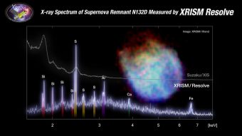 Questo spettro del resto di supernova N132D, ottenuto con lo strumento Resolve di Xrism, ben esemplifica le potenzialità del telescopio spaziale X giapponese per l’osservazione spettroscopica di questo tipo di oggetti. Crediti: Jaxa/Nasa/Xrism Resolve and Xtend