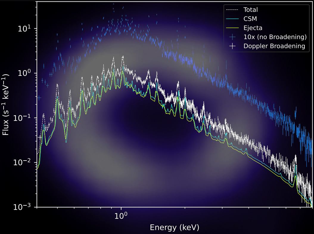 Spettro sintetico Xrism di Sn 1987A ottenuto nello studio di Sapienza et al. Lo spettro bianco comprende tutte le componenti fisiche e dinamiche considerate nello studio. Lo spettro blu, spostato verso l’alto per migliorare la visualizzazione, non include gli effetti derivanti dalla dinamica del materiale e alcuni effetti strumentali. Le curve azzurra e verde più in basso rappresentano rispettivamente lo spettro generato dal mezzo circumstellare investito dall’onda d’urto e il contributo degli ejecta. L’immagine sullo sfondo mostra Sn 1987A vista in raggi X dal telescopio spaziale Chandra della Nasa. Crediti: Sapienza et al., ApJL, 2024; Nasa/Cxc/Psu/S.Park e D.Burrows