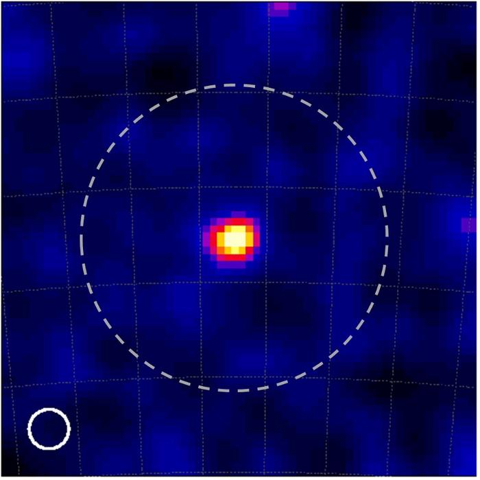 L’immagine della pulsar della Vela ottenuta grazie al dispositivo dell’università di Kobe. Il cerchio in basso a sinistra indica la dispersione dell’immagine della pulsar ottenuta con il nuovo sistema mentre il cerchio grande tratteggiato rappresenta la dispersione della migliore immagine a raggi gamma precedente di un oggetto stellare diverso. Crediti: Graine Collaboration