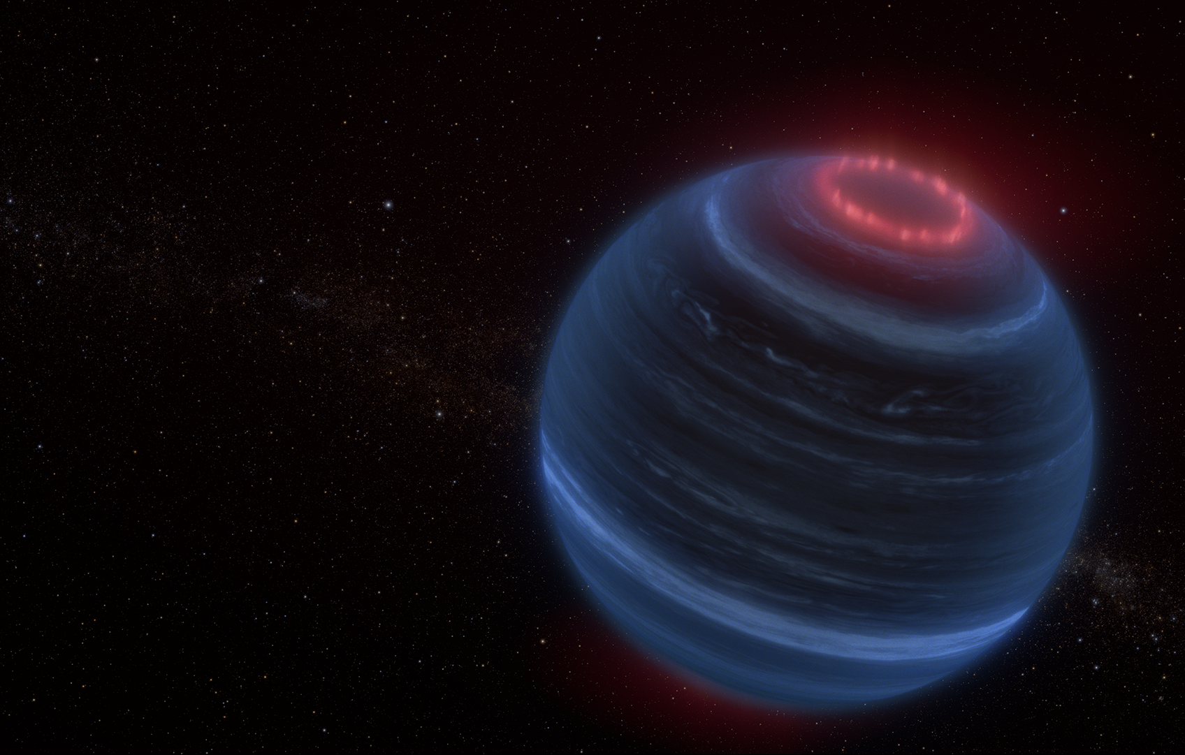 Rappresentazione artistica della nana bruna W1935, che si trova a 47 anni luce dalla Terra. Gli astronomi che utilizzano il telescopio spaziale James Webb hanno trovato emissioni infrarosse di metano provenienti dai poli di W1935. Si tratta di una scoperta inaspettata perché la nana bruna è fredda e non ha una stella ospite; pertanto, non c’è una fonte evidente di energia per riscaldare l’atmosfera superiore e far brillare il metano. Il team ipotizza che l’emissione di metano possa essere dovuta a processi che generano le aurore, qui evidenziate in rosso. Crediti: Nasa, Esa, Csa, Leah Hustak (STScI)
