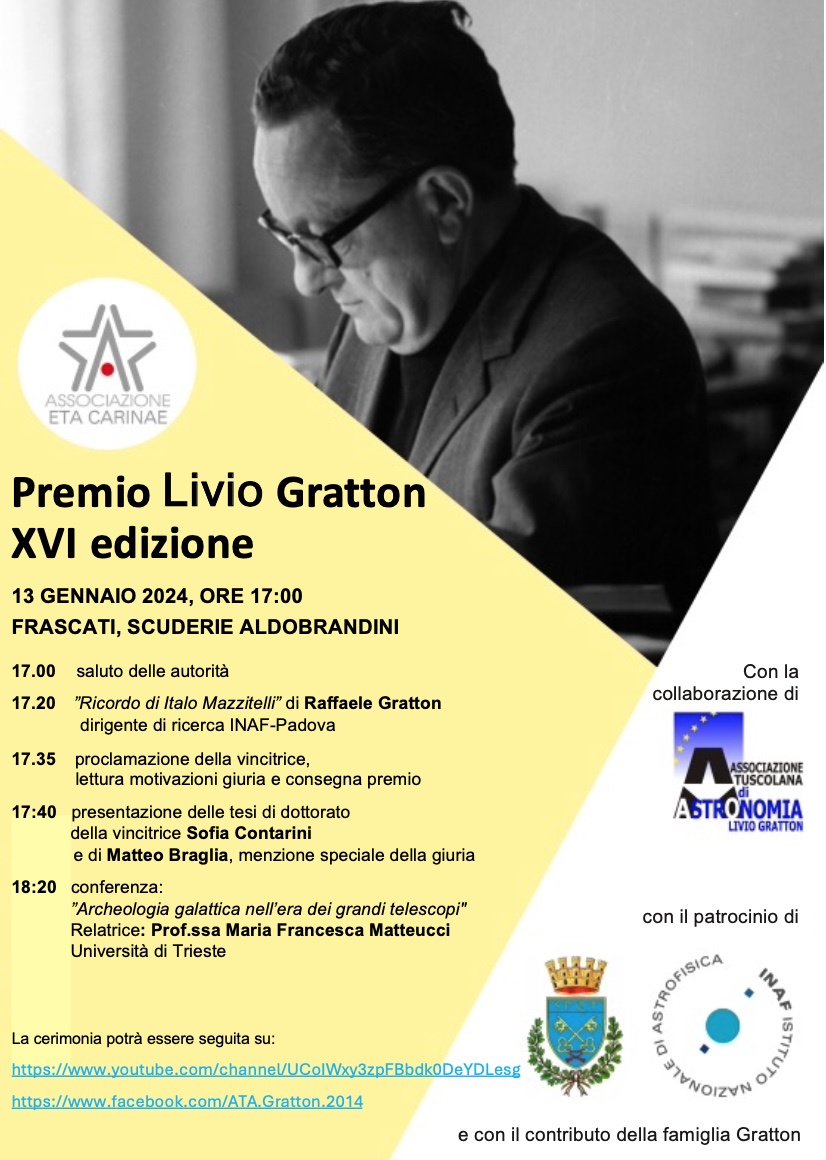 La cerimonia di consegna, aperta al pubblico, si terrà a Frascati domani, sabato 13 gennaio 2024, a partire dalle ore 17.00, all’Auditorium delle Scuderie Aldobrandini. L’evento potrà essere seguito online sul canale YouTube dell’Associazione tuscolana di astronomia. Durante la cerimonia Raffaele Gratton (Inaf Padova) ricorderà Italo Mazzitelli, astronomo allievo di Livio Gratton, recentemente scomparso e la premiazione sarà seguita dalla conferenza pubblica tenuta da Maria Francesca Matteucci (Università di Trieste) sul tema “Archeologia galattica nell’era dei grandi telescopi”. Com’è tradizione fin dalla prima edizione, verrà consegnata alla vincitrice una pergamena del Maestro Gianfranco Cresciani.