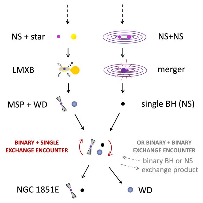 Le regioni centrali di Ngc 1851 sono così affollate che le stelle possono interagire tra loro, sconvolgendo le loro orbite e nei casi più estremi scontrandosi. Si ritiene che sia stata una di queste collisioni tra due stelle di neutroni a creare l’oggetto massiccio che ora orbita attorno alla radio pulsar. Tuttavia, prima che venisse creata l’attuale binaria, la radio pulsar deve aver acquisito materiale da un’altra stella in una cosiddetta binaria a raggi X di piccola massa. Un tale processo di “riciclaggio” è necessario per riportare la pulsar alla velocità di rotazione attuale.