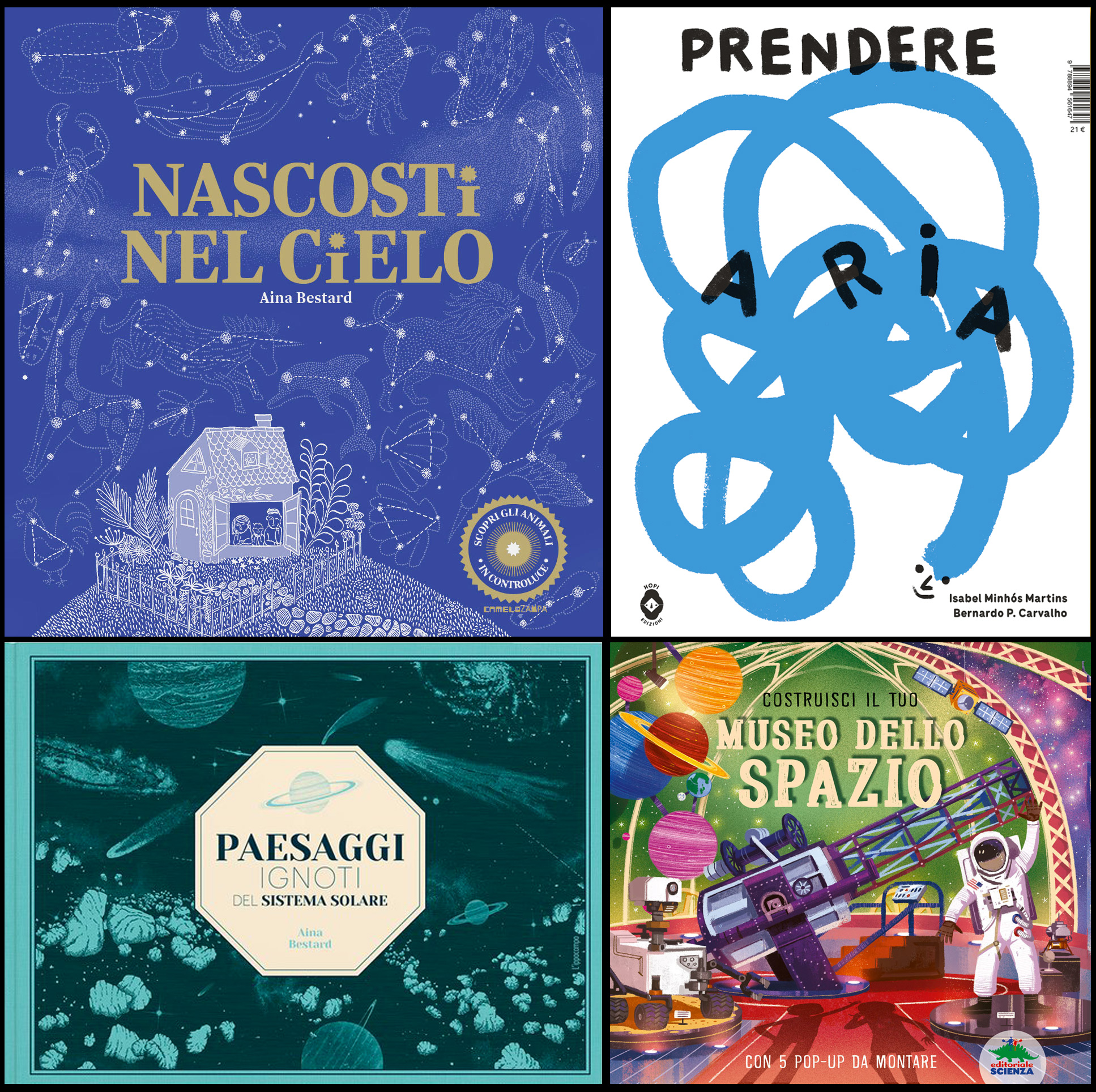 Da in alto a sinistra in senso orario: Aina Bestard, “Nascosti nel cielo” (Camelozampa, 2022, 26 pp. 19 euro); Isabel Minhos Martins e di Bernardo P. Carvalho , “Prendere aria, prendere il Sole” (Hopi, 2022, 180 pp); Claudia Martin, “Costruisci il tuo museo dello Spazio” (Editoriale Scienza, 2023, 30 pp., 21,90 euro); Aina Bestard, “Paesaggi ignoti del Sistema solare” (L’ippocampo, 2022, 90 pp., 19,90 euro)