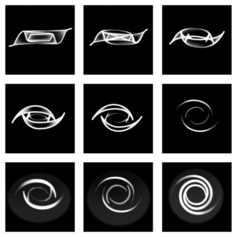 Un modello di Ngc 4753 visto da diversi punti di osservazione, che corrispondono a orientazioni diverse. Da sinistra a destra e dall’alto in basso, l’angolo della linea di vista rispetto al piano equatoriale della galassia varia da 10° a 90° con incrementi di 10°. Sebbene galassie simili a Ngc 4753 non siano rare, solo alcuni orientamenti di osservazione permettono di identificare facilmente un disco molto contorto. Crediti: NOIRLab/ NSF/ AURA/ Steiman-Cameron et al./ P. Marenfeld